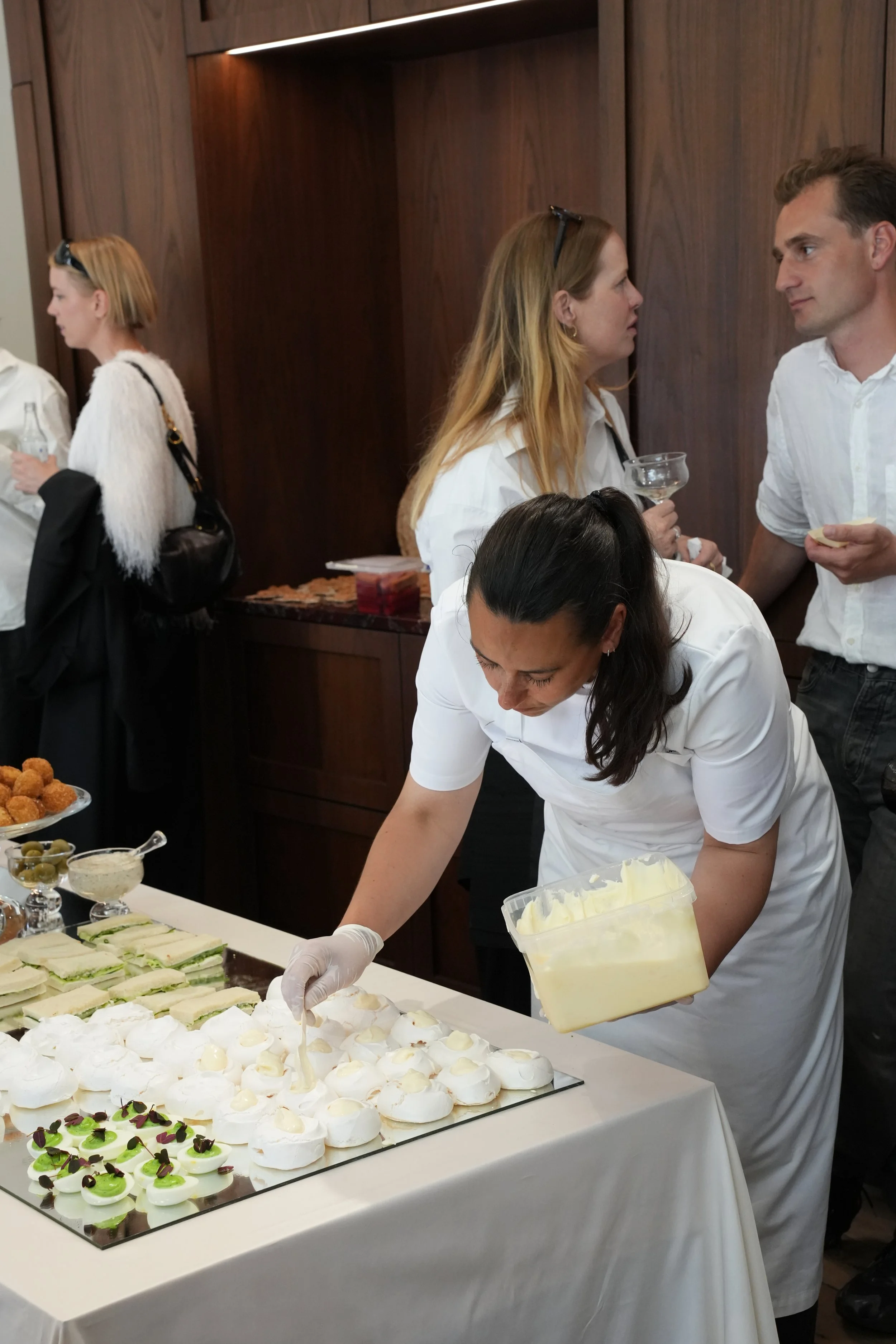 During the first day, we hosted a lunch event and talk for friends of the house, local and international press, architects, and close business partners. The food was a culinary blend of Danish, Swedish, and Italian small dishes — a tribute to the company’s roots. Danish brand, Swedish founder and owner and our main production in Italy. Alongside our new red Piccolo marble table and our silver Roots, we also received a 10 kg half wheel of parmesan delivered directly from Italy for the occasion.